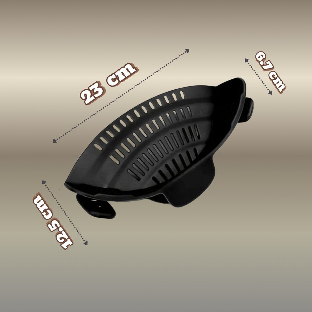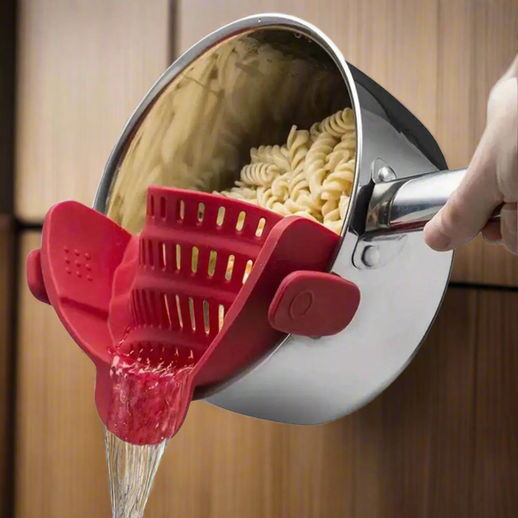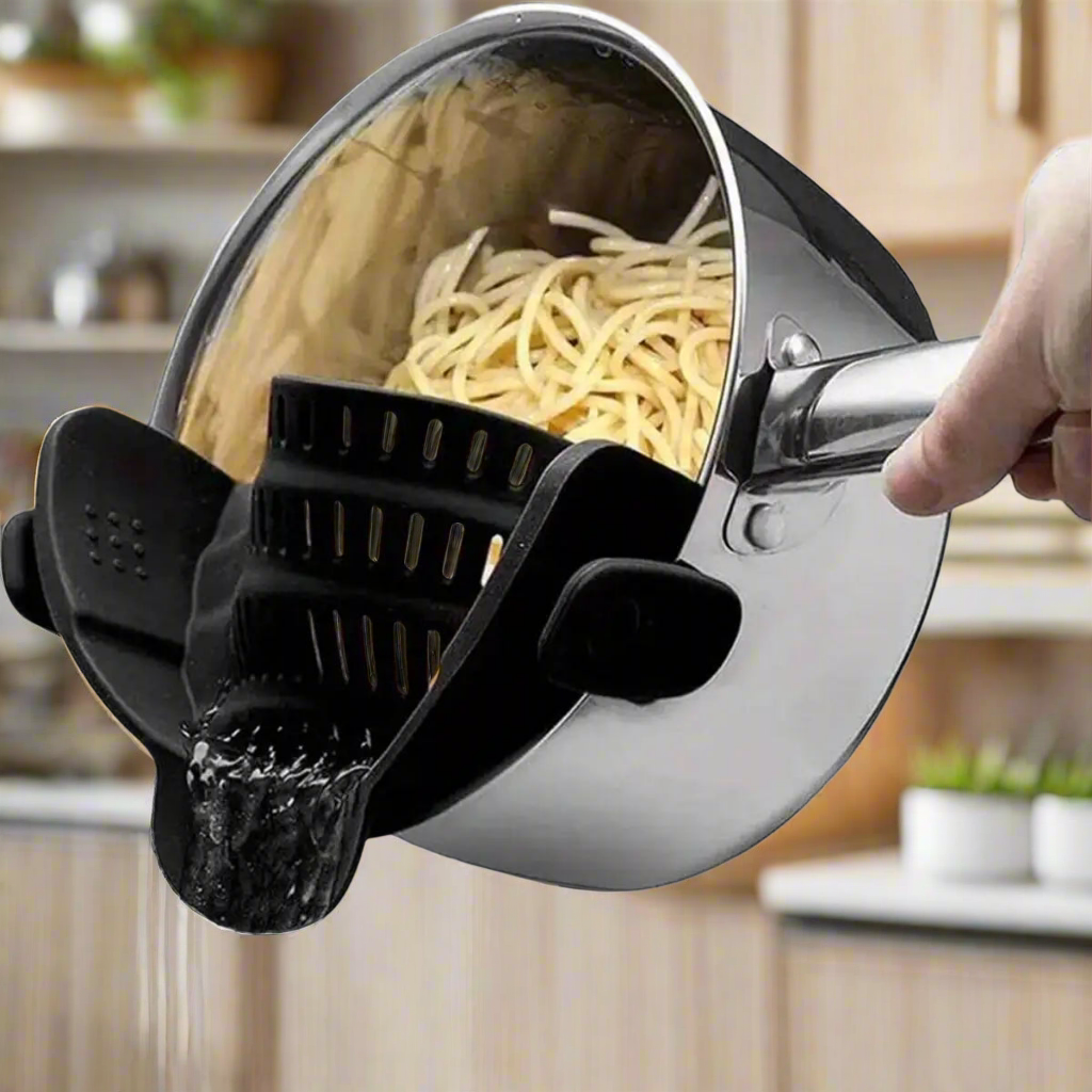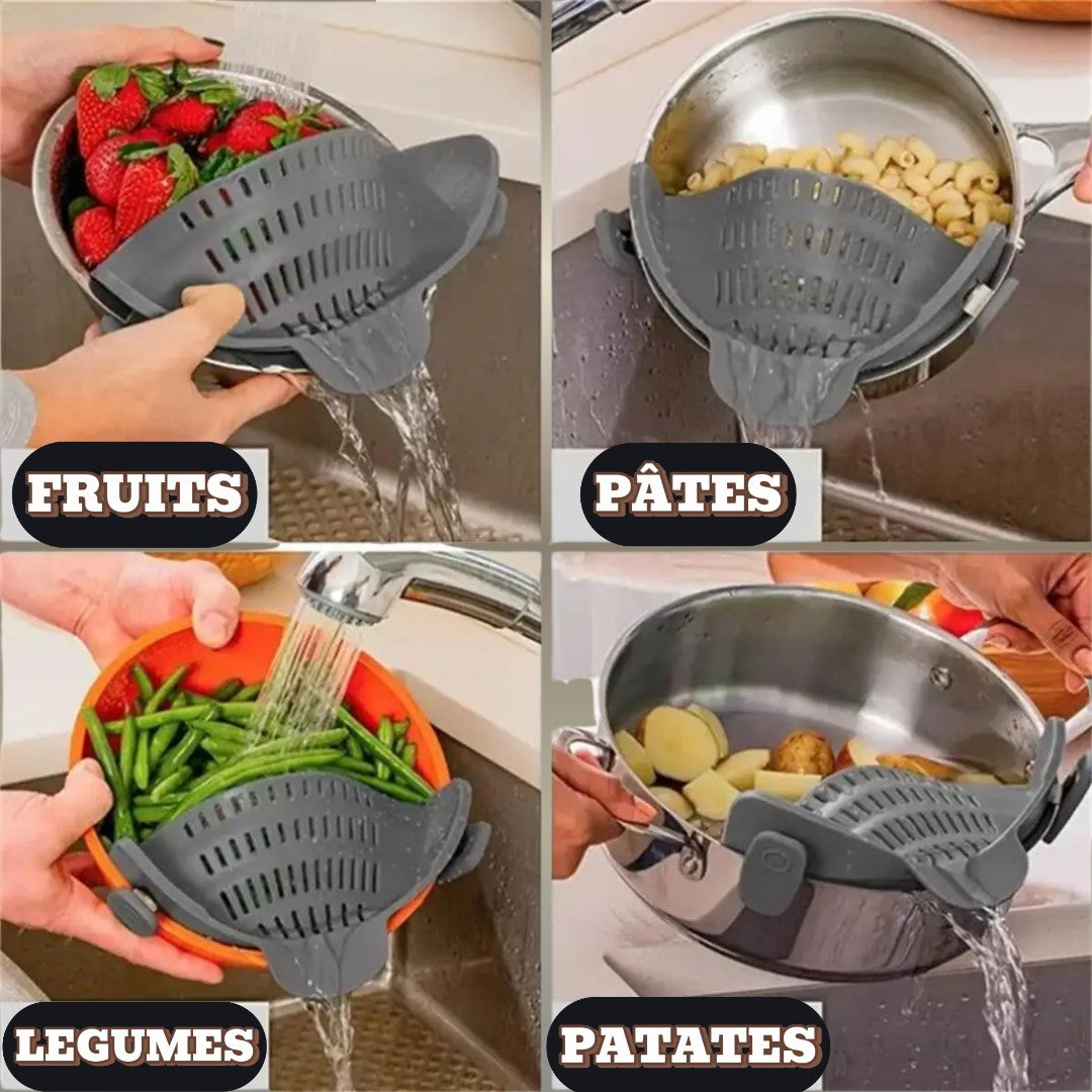 Fini les acrobaties avec une passoire classique ! Cette passoire révolutionnaire se clipse directement sur votre casserole ou marmite et vous permet d'égoutter vos pùtes, légumes ou bouillons en toute sécurité, sans transvaser, et sans salir un ustensile de plus.